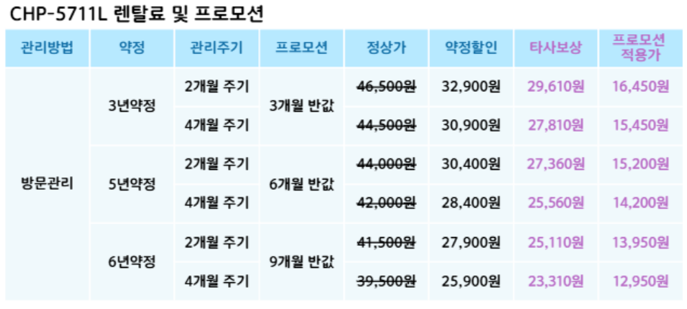 CHP-5711L 코웨이 [코웨이] 워터 스탠드2(냉온정) 제품분류 정수기 정수방식 탱크형 기능 냉온전용 A/S기간 렌탈기간내 최저 렌탈가 월 23,310 (렌탈가) 제휴카드 할인가 월 (렌탈가) 3년 5년 6년 방문관리/4개월(타사보상) 방문관리/4개월 방문관리/2개월(타사보상) 방문관리/2개월 제품색상 선택 화이트 + 0원 할인 제휴카드 보기 렌탈신청 장바구니