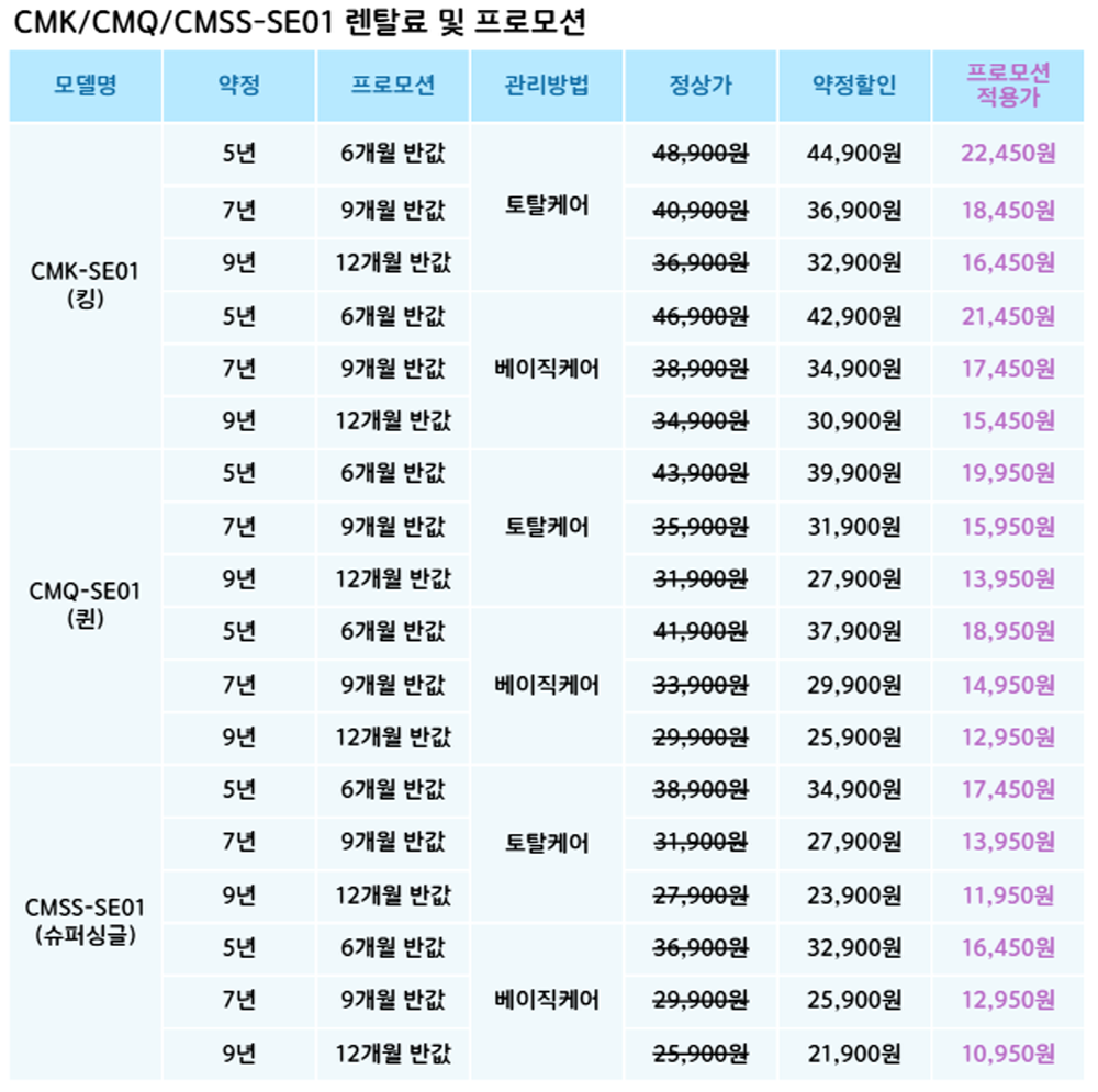 CMSS-SE01,CMQ-SE01,CMK-SE01 코웨이 [코웨이] 비렉스 더블사이드 매트리스 (슈퍼싱글,퀸,킹) 제품분류 매트리스 A/S기간 렌탈기간내 최저 렌탈가 월 21,900 (렌탈가) 제휴카드 할인가 월 (렌탈가) 5년 7년 9년 슈퍼싱글 퀸 킹 베이직케어 토탈케어 할인 제휴카드 보기 렌탈신청 장바구니